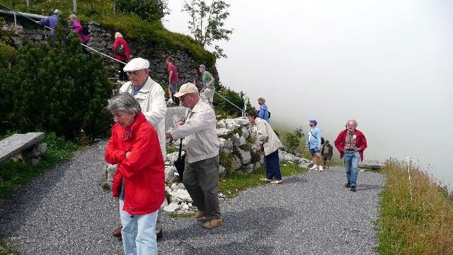 Am Dienstag, den 21. August 2007, war der Himmel gar nicht himmlisch anzusehen. Trotzdem machten sich 21 Personen auf den Weg Richtung Ebenalp. Mit betonter Pünktlichkeit der SBB und AB kamen wir um 11.11 h in Wasserauen an. Die Drahtseile der Ebenalp-Bergbahn verloren sich in einer Wolkenwand. Trotzdem war wir fasziniert beim Eintauchen in den Nebel. Auf der Ebenalp angekommen, wurden wir für 5 Minuten belohnt für einen grandiosen Blick auf die Bergketten. Das Tal unten war geschlossen in einer Wolkendecke. Im Restaurant genossen wir das reichhaltige Menü und die sprichwörtliche Gastfreundschaft der Appenzeller. Um 13 Uhr starteten der Sänger Gerhard und Fotograph Wolfgang zum Abstieg Richtung Wildkirchli - Schwende. Trotz teilweisem Nebel war der Abstieg visuell und körperlich begeisternd. Um 15.20 h wurde gemeinsam die Rückfahrt angetreten und zum Abschied schien dann zeitweise sogar die Sonne im Appenzellerland. Einen herzlichen Dank an die Organisatoren Eugen Gerschwiler und Oskar Imthurn!